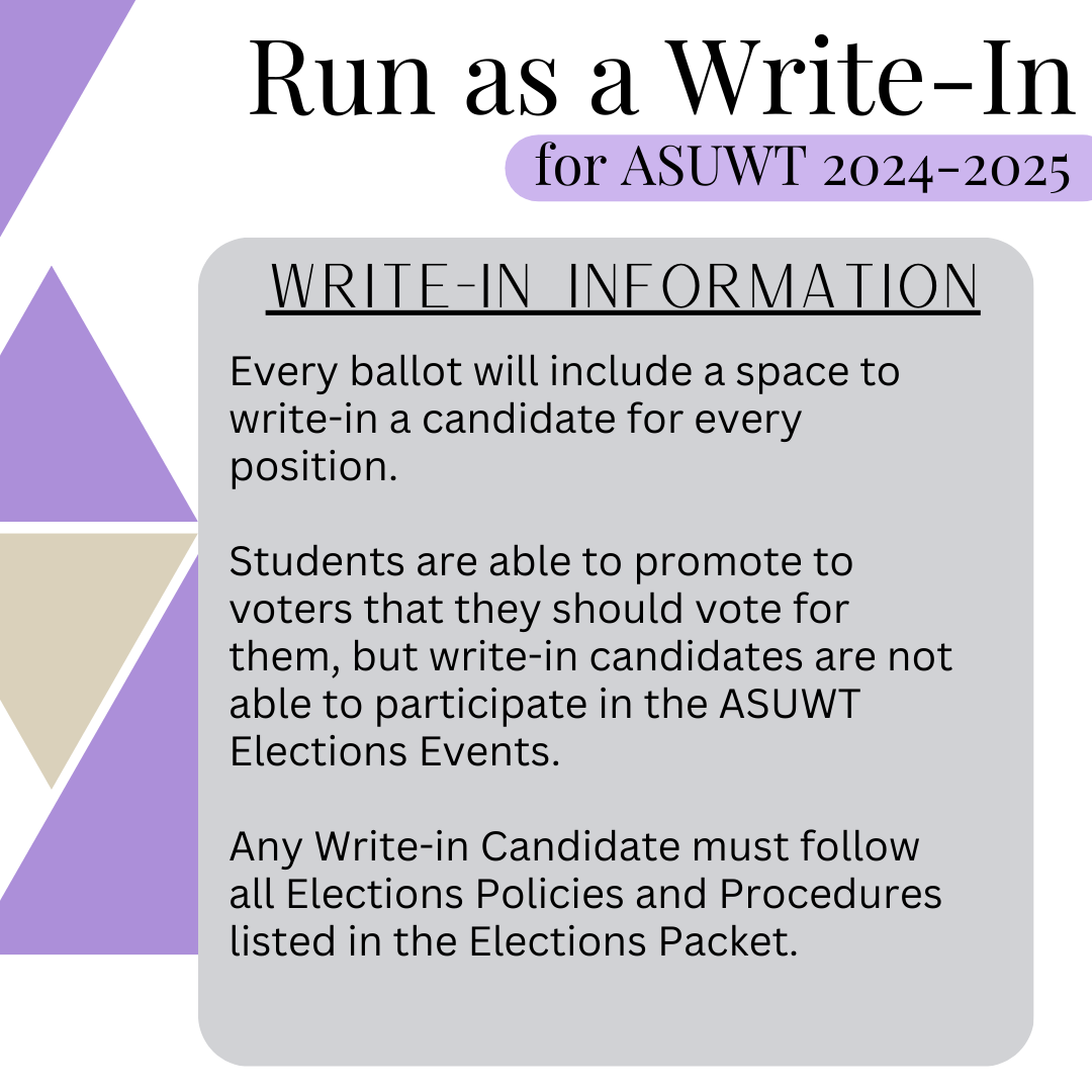 It is the candidate's responsibility to review the 2023 ASUWT Elections Candidate Packet in full. Lack of knowledge of the Elections Code is NOT a valid excuse for violations.