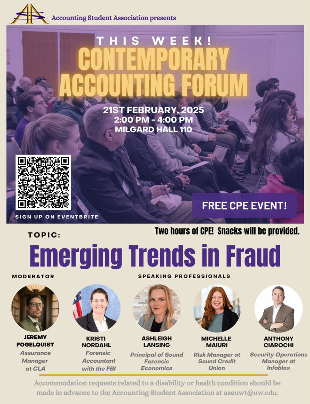 Contemporary Accounting Forum 2025 was hosted on Friday, February 21st from 2:00-4:00pm in Milgard Hall 110 and joined by expert panelists and moderator! This year’s topic was Emerging Trends in Fraud. With the support of the Milgard accounting faculty, this CPE eligible event was FREE! Food was provided.