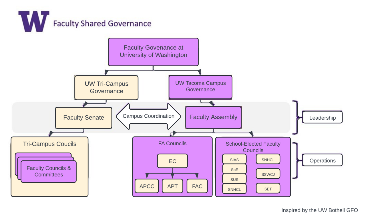 The Faculty Assembly is the governing body of the University of Washington Tacoma Faculty (23- 41). The purpose of the Faculty Assembly shall be to serve as a forum for faculty deliberation, decision-making, and for the formulation and conveyance of advice to the Chancellor and Vice Chancellors of the University of Washington Tacoma on a wide range of matters related to the mission of the University of Washington Tacoma. This body shall be concerned with all domains of faculty authority and duties of the University of Washington Tacoma faculty and the professional and personnel issues affecting faculty.