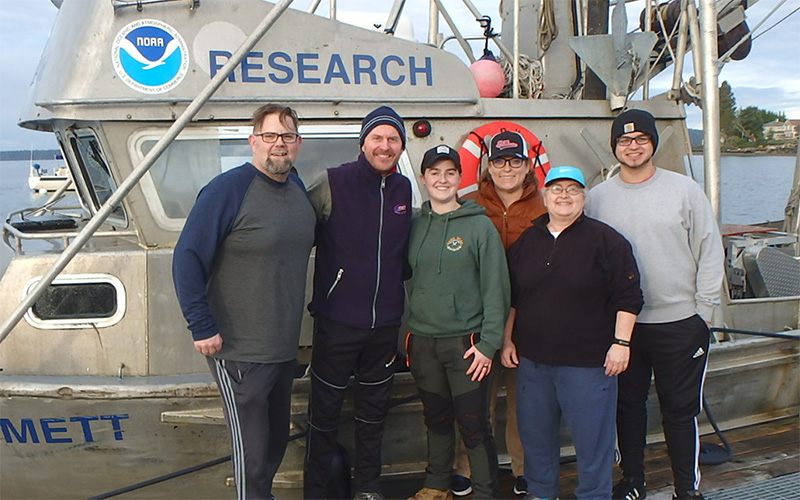 (Image above: A sampling crew is about to go out from Olympia, Wash., aboard the Robert L. Emmett, a NOAA research vessel. From left: Wes Parker, captain, NOAA; Dan Lomax, 1st mate, NOAA; Caitlyn McFarland, UW Tacoma Environmental Science senior; Julie Masura, HAB study co-PI, UW Tacoma senior lecturer; Cheryl Greengrove, HAB study PI, UW Tacoma associate professor; Gibson French, UW Tacoma Environmental Science junior. Photo courtesy Cheryl Greengrove.)