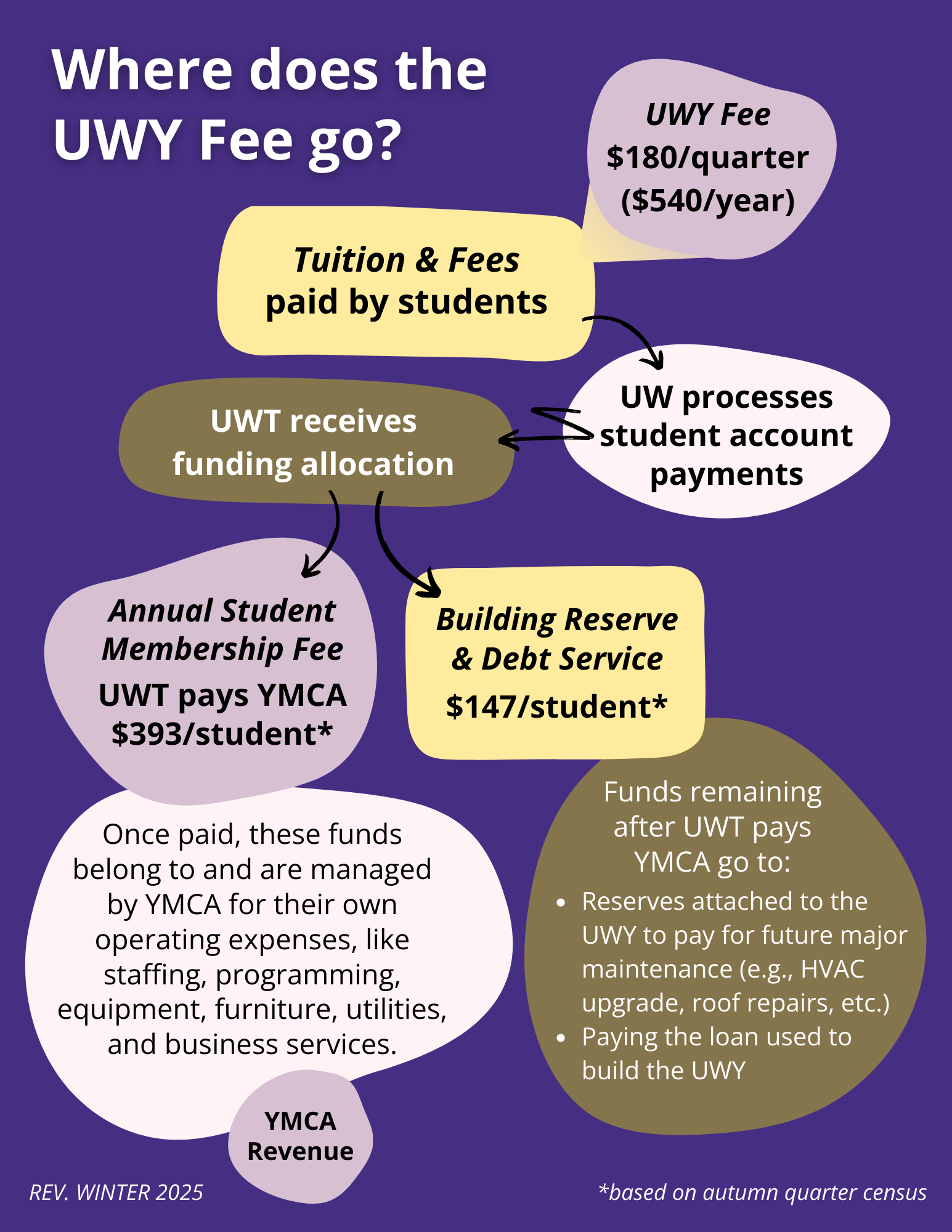 The fee is authorized by the state legislature and was established by the SAFC. It pays for UW Tacoma students to use YMCA facility and programs. It also pays for debt from constructing the UWY building.