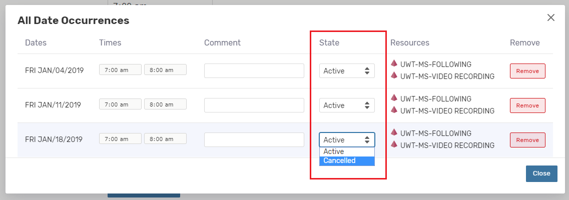3. Scroll to the date and time section and then click the "view all occurrences" button found under the interactive calendar. Change the status of the date(s) you want to cancel from "active" to "cancelled." When finished, close the window. Remember to enter a revision note with your initials which explains the change you made to the scheduler. |
