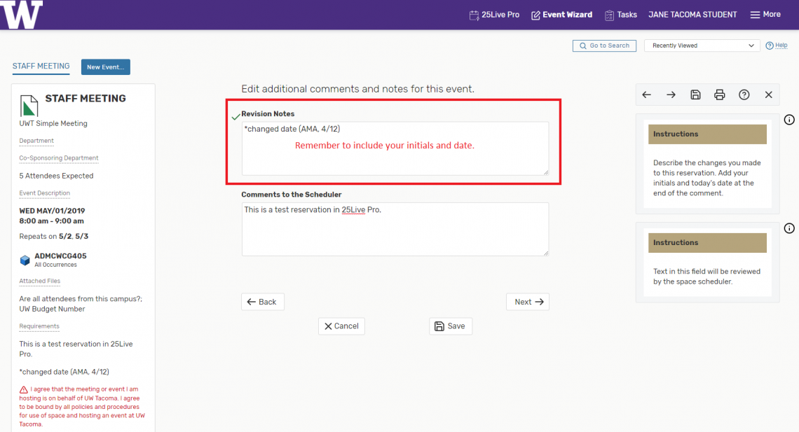 | 2. Before clicking "Save," briefly describe the changes you made with your initials and date in the Revision Notes field. |
